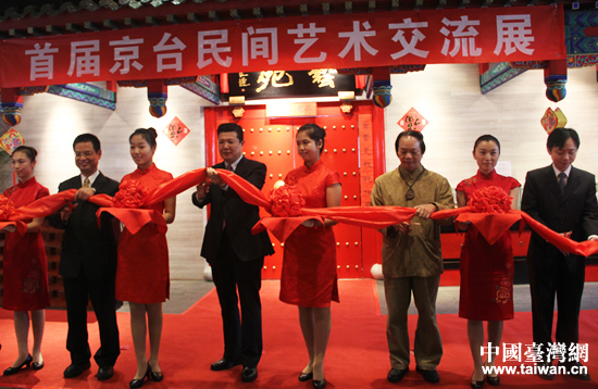首屆京臺民間藝術交流展于2013年9月26日隆重開幕,北京市臺辦、北京市臺聯(lián)、中華青年企業(yè)家協(xié)會、北京大碗茶文化發(fā)展有限公司、北京老舍茶館有限公司的領導和嘉賓出席剪彩儀式。(中國臺灣網(wǎng) 楊永青 攝)