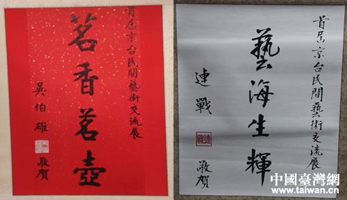 很多臺灣同胞到大陸來,都會到老舍茶館感受一下京味文化的魅力,連戰(zhàn)曾專程到老舍茶館品茗賞戲。圖為連戰(zhàn)和吳伯雄為此次展覽書寫的賀詞。(中國臺灣網(wǎng) 楊永青 攝)