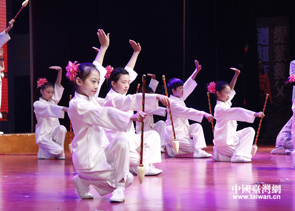 來自北京市西城區小學校的同學們表演毛筆操,展示國學文化。(中國臺灣網 普燕 攝)