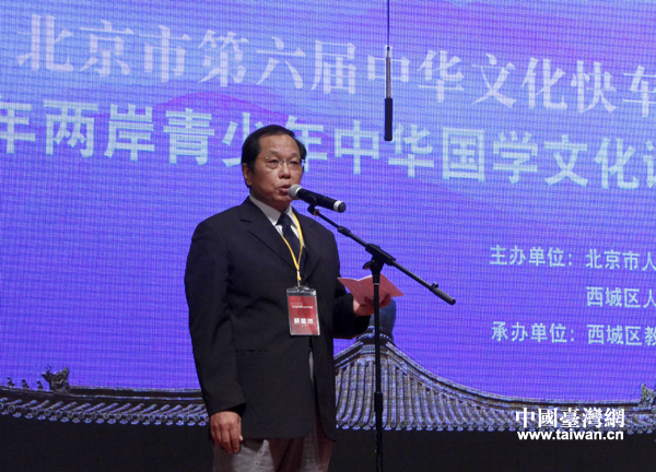 28日,北京市第六屆中華文化快車——2013年兩岸青少年中華國學文化課堂交流活動在北京四中舉行。新竹衷新學校董事會董事蘇龍德在活動中致辭。(中國臺灣網 普燕 攝)
