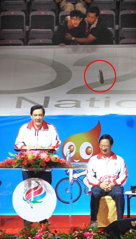 2013年臺灣地區運動會開幕典禮10月19日在臺北小巨蛋舉行,觀眾席有民眾丟鞋抗議。(圖片來源:臺灣聯合新聞網)