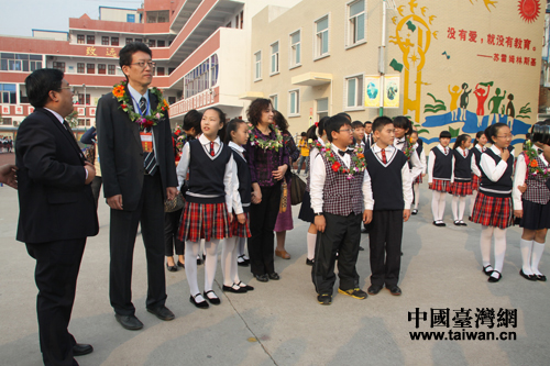 臺灣曹公小學(xué)校長彭連煥帶領(lǐng)該校師生代表參訪河南省沁陽市實驗小學(xué)。(中國臺灣網(wǎng) 扶海濤 攝)