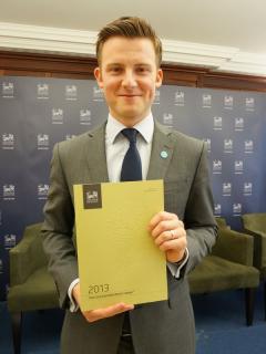 英國智庫29日公布2013全球繁榮指數報告,臺灣總排名第22,較去年下跌2名。圖為負責繁榮指數調查主任甘斯特和報告。(臺媒圖)
