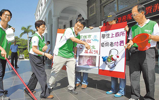 高雄市教育產(chǎn)業(yè)工會昨上午到市議會向教育局陳情,并攜帶尿桶、刷子和尿布,演出行動劇,嘲諷學(xué)生若不繳廁所清潔費,只能減少上廁所頻度或自行清潔整理。