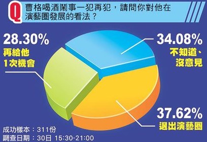 臺(tái)媒昨針對(duì)“曹格喝酒鬧事一犯再犯,請(qǐng)問你對(duì)他在演藝圈發(fā)展的看法?”進(jìn)行民調(diào),311份樣本中,37.62%民眾認(rèn)為他應(yīng)退出演藝圈,28.3%民眾認(rèn)為應(yīng)再給他1次機(jī)會(huì),34.08%民眾則表示不知道、沒意見。(中國(guó)臺(tái)灣網(wǎng) 高旭)