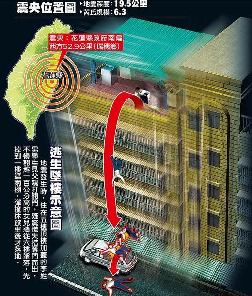地震發(fā)生時,住在五樓頂樓加蓋的李姓男學生見父親打開門,疑驚慌失措奪門而出,不慎翻越一百公分高的女兒墻從六樓墜落,先掉到一樓遮雨棚,彈撞休旅車后才落地。