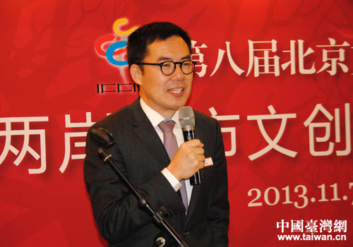 臺灣文創(chuàng)參訪團(tuán)團(tuán)長、臺北市文化局長劉維公在第八屆北京文博會兩岸城市文創(chuàng)交流酒會上致辭。(中國臺灣網(wǎng)北京通訊員 郭寧 攝)