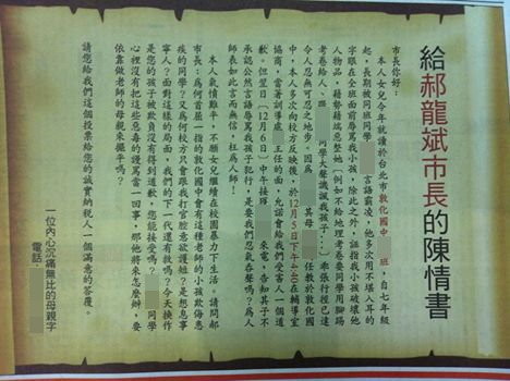 臺北市1名家長不滿女兒遭霸凌,砸80萬元新臺幣在報紙頭版抗議學(xué)校處置不公。(來自臺媒)