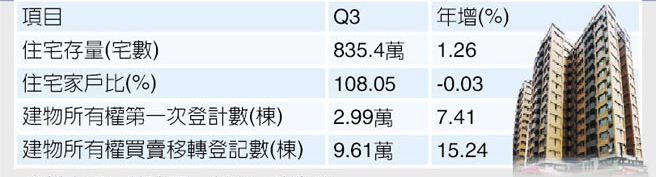 根據該項信息統計還指出,第3季度臺灣建筑物所有權買賣移轉登記數為9.6萬棟,雖較上季略減4%,但比去年同季增加15%,該數字顯示買賣房屋的人數較去年增加。