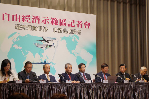 臺當局“行政院”公布自由經濟示范區規劃案,圖左三為臺灣“財政部長”張盛和、左四為臺當局“行政院副院長”毛治國、左五為“經建會主委”管中閔。(臺媒圖)