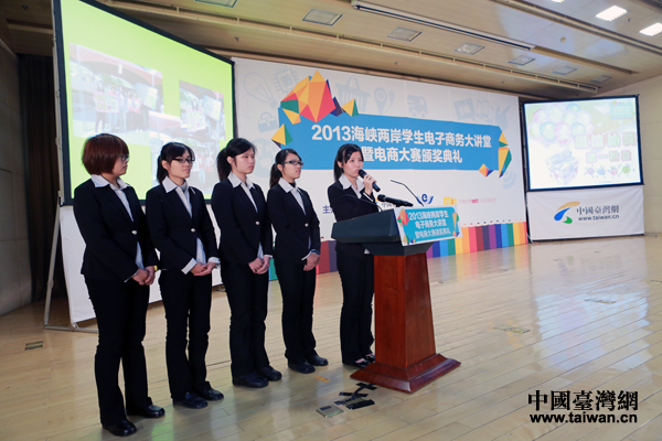 20日下午,由中國臺(tái)灣網(wǎng)(www.zhaoqun5.com)、海峽兩岸互聯(lián)網(wǎng)交流委員會(huì)、中華臺(tái)灣MIT正品推廣協(xié)會(huì)主辦的“2013海峽兩岸學(xué)生電子商務(wù)大講堂暨電商大賽頒獎(jiǎng)典禮”在京舉行。圖為臺(tái)灣區(qū)總決賽第一名獲獎(jiǎng)團(tuán)隊(duì)分享參賽心路歷程與收獲。(中國臺(tái)灣網(wǎng) 于斯文 攝)