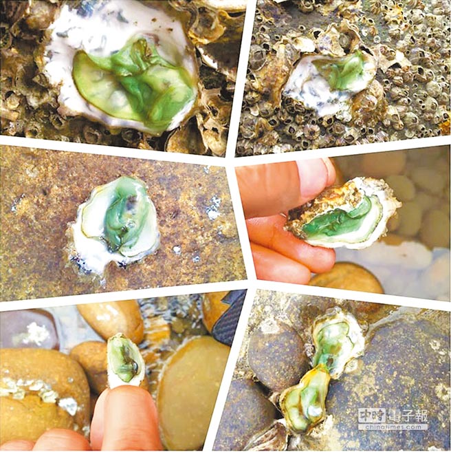 由于污染嚴重,桃園海岸礁巖上的石蚵已轉墨綠色,不能食用。(圖片來自臺媒)