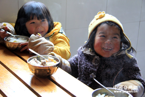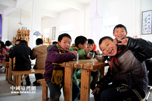 冷水鎮小學經過三年教育實驗,學生精神面貌發生巨大變化,圖為學生們在食堂愉快就餐。(中國臺灣網 李徽 攝)