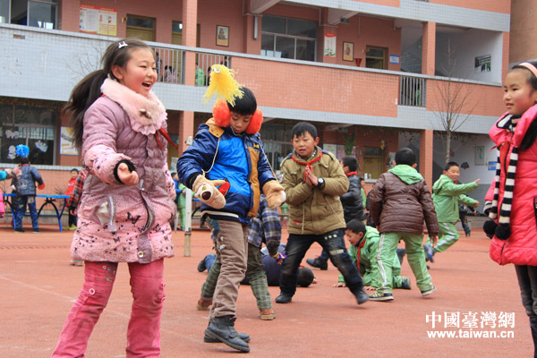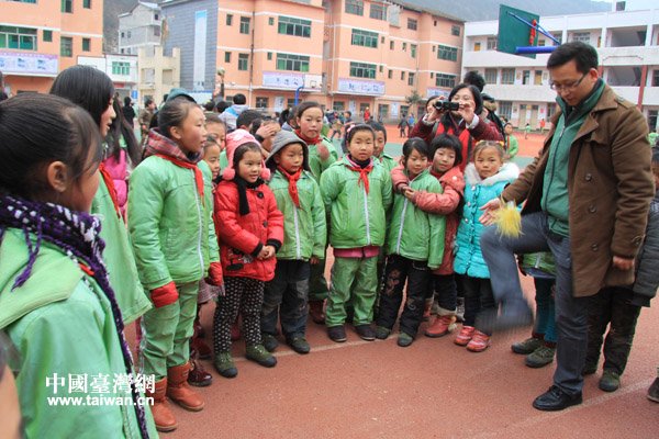冷水鎮小學經過三年教育實驗,學校環境翻天覆地。圖為頂新公益基金會志愿者與學生們在運動場做游戲(中國臺灣網 李徽 攝)