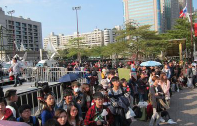 臺(tái)北市政府廣場(chǎng)今天下午涌入許多排隊(duì)等候領(lǐng)取“圓仔眼罩”及“加油棒”的民眾。來(lái)自臺(tái)媒