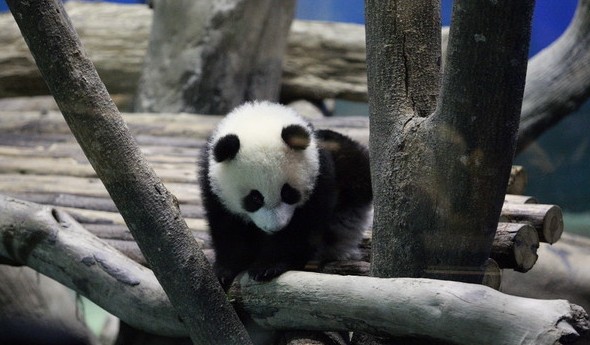 當(dāng)天傍晚6點(diǎn),工作人員將出生182天的“圓仔”從房間中抱出,放在由玻璃隔開(kāi)的展館中供媒體拍攝。與“圓仔”一同出現(xiàn)的還有媽媽“圓圓”。母女倆一起玩耍了一會(huì)兒后就分開(kāi)活動(dòng)。“圓仔”步伐穩(wěn)健、能走能爬、活動(dòng)自如,一會(huì)就爬上由樹(shù)干搭成的木頭架子,在搖頭晃腦之余還不時(shí)舔舔樹(shù)干,有時(shí)還趴在樹(shù)干上休息。