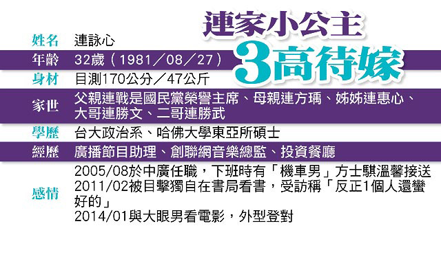 中國臺灣網1月19日消息 據臺灣媒體報道,國民黨榮譽主席連戰育有2子2女,至今只剩32歲的小女兒連詠心還未結婚。前晚,有記者目擊她和1名高大男子在影城買快餐、喝飲料,身旁的“他”是不是男友?連詠心否認,表示2人是“大學同學”。