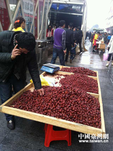 步行街上支起了一個紅棗攤。滿滿的紅色透出十足的年味。(中國臺灣網(wǎng) 高斯斯 攝)