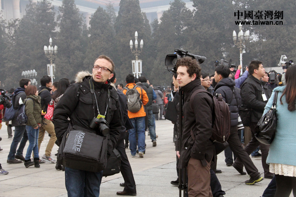 這兩位外國記者對身邊的熱鬧表現(xiàn)的很淡定。(中國臺灣網(wǎng) 王怡然 攝)