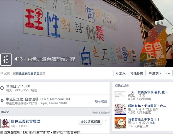 中國臺灣網4月12日消息 據臺灣“東森新聞”報道,反服貿學生10日晚間6點正式退場,但有“不同的聲音”發起活動,要民眾守護臺灣。臺灣白色正義社會聯盟9日發起“白色力量臺灣前進之夜”活動,號召民眾穿著白色上衣,4月13日下午4點在自由廣場(中正紀念堂)集結,為民主法治發聲,并提倡沉默聲音要勇敢站出來,矯正社會匡正民主做正義的事情。