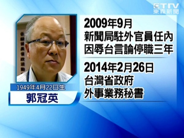 由于郭冠英在2009年間以“范蘭欽”等為筆名發表文章,遭“監察院”通過彈劾,并經“公務員懲戒委員會”決議“撤職并停止任用3年”。郭冠英3月出任“省府外事業務秘書”,4月滿65歲屆齡退休后,可領取每月高達8萬余元月退俸,造成社會輿論嘩然,抨擊有濫用公共資源之虞,及違反程序、玩弄體制、因人設事、特權圖利等不公不義等違失。