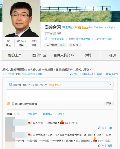 據(jù)臺(tái)灣東森新聞報(bào)道,秦厚修是湖南長(zhǎng)沙人,從湖南、香港輾轉(zhuǎn)來(lái)到臺(tái)灣,2日因多重器官衰竭病逝,結(jié)束93歲的人生。她逝世的消息曝光后,大陸媒體紛紛報(bào)導(dǎo),前國(guó)民黨“立委”邱毅也于晚間7時(shí)許發(fā)微博:“愿馬媽媽好走,馬英九節(jié)哀。”許多大陸網(wǎng)友轉(zhuǎn)貼消息,3小時(shí)就涌入破千條留言。
