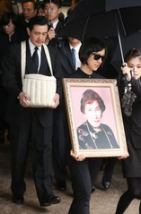 馬英九捧骨灰送母親最后一程。馬英九母親秦厚修2日病逝,5日上午在臺北市第二殯儀館大殮、家祭及火化,馬英九(前左)手捧骨灰,女兒馬唯中(右2)手捧遺照,將送至富德公墓。(圖片來源:臺灣“中央社”)