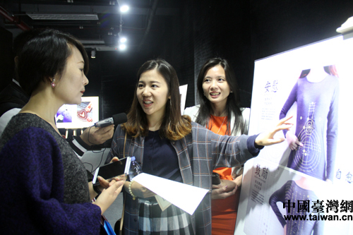 中國傳媒大學學生陳粵(中)攜《自愈——穿在身上的穴位圖表》亮相第二屆“華燦獎”作品展。(中國臺灣網記者 李杰 攝)