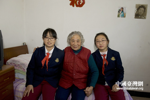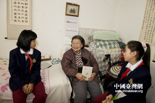 梁淑琴老人的女兒在國外定居,她說看到了孩子們就想起了自己的外孫女,要和兩個“外孫女”合個影。 (中國臺灣網(wǎng)發(fā) 尹珺攝)