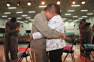 集體宣誓后,家長被允許上臺與孩子見面,沒有隔板隔著,王強(qiáng)與父親緊緊相擁。