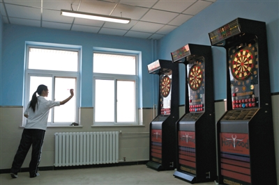 “這是專門用于軟鏢的。”該校飛鏢課教師王建平介紹,飛鏢和鏢盤上都是磁石,應用于初學者可以保證安全。