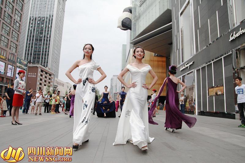 四川新聞網成都5月4日訊(記者 張進春)5月3日,20多名準空姐化身模特身穿美麗華服“空降”成都IFS廣場,她們以“快閃”的方式慶祝五四青年節,展示傳統服飾和書法文化。
