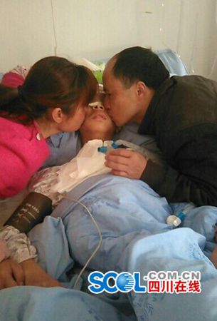 13歲的鐘天亮是新都人,今年2月20日,大年初二下午4:50,和爸爸媽媽一起走完人戶的鐘天亮在回家路上出車禍,被送到當地醫院搶救,但終因傷勢過重,他再也沒有醒來,一直處于昏迷狀態……盡管醫院屢屢下達病危通知書,但爸爸鐘先祿和媽媽劉元英都咬著牙堅持,因為醫生告訴他們:如果奇跡出現,孩子就會醒來。鐘先祿和劉元英苦苦等候著那個奇跡,鐘先祿幾乎已到了如此如狂的地步,拿著兒子的照片,見人就問:“那里可以找到奇跡,讓我兒子醒過來。”可是,奇跡始終沒有出現……