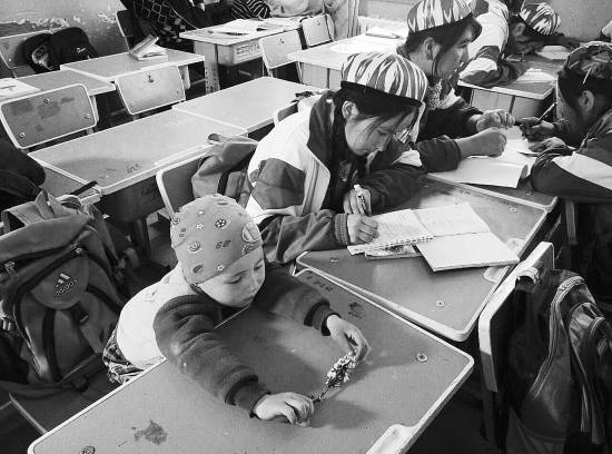 有時候學習成績好的女學生會幫助老師帶孩子,或是帶著自己的弟弟、妹妹到班里一起上課。 麥爾旦·吐拉江/攝