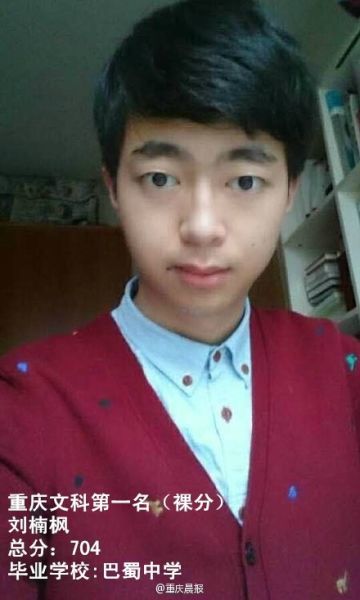重慶2015文科狀元 劉楠楓 總分704分,其中數學150、英語146、文綜279