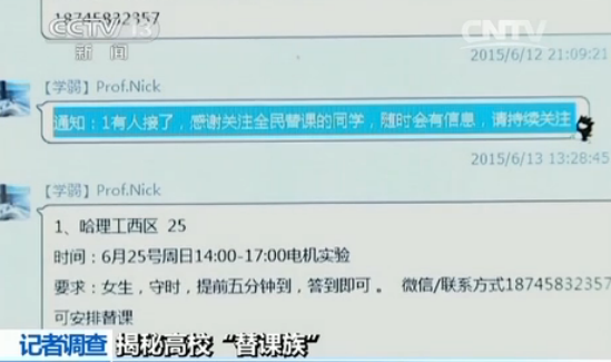 最近記者接到了一個舉報電話,舉報人說現在有的大學生為了逃課,拿著父母給的錢雇人代替自己上課。經記者調查發現,除了替課,替體檢、替就寢等都有存在。