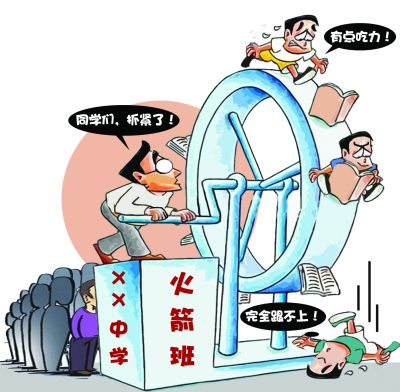 漢口一所高中負責(zé)分班的副校長說,每年新生中,99%的家長不管孩子成績?nèi)绾危际菑娏乙筮M火箭班,他們認為,即使自己孩子的成績沒那么優(yōu)秀,但進了火箭班,老師配備得好,學(xué)習(xí)環(huán)境好,三年以后就有了升學(xué)保證,“即使拖在后面也不會太差”。