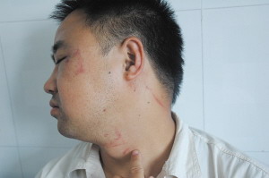 昨日,記者聞訊趕到醫院時,被打的張醫生還沒有下班,記者看到張醫生左眼周圍青腫,而且脖子上到處都是被抓傷的痕跡。