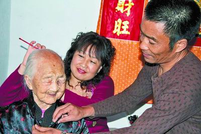 老人耳背,與她交談?dòng)行├щy,一句話常常要說(shuō)幾遍。但當(dāng)記者大聲問(wèn)她“這家人待你好不好”時(shí),老人沒(méi)等問(wèn)第二遍,便拍著胸脯大聲說(shuō):“這家人待我好著呢!我這么大年紀(jì)了,還有這樣的身體,如果家里人待我不好,我能活到今天?”