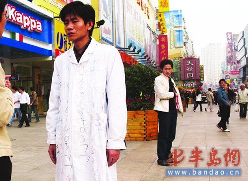 “在臺東三路步行街上,有名穿白色大褂的年輕人自稱愿意出租自己,愿拿自己的身體當廣告牌招商。”下午2時許,接到反映后記者趕到現場。記者看到,該男子身上穿著一件白色的大褂,身后中間位置用墨水寫著“本人出租”,兩側寫著“人體廣告”與“私人保安伴游”字樣,在衣服中縫處還寫有一手機號碼。該男子的舉動吸引了不少路人駐足觀看。