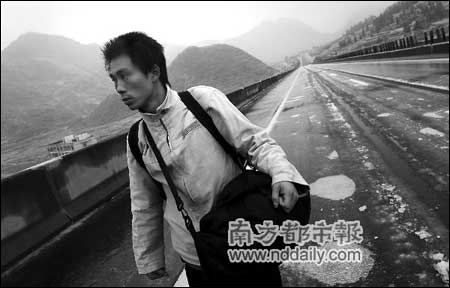 他的女朋友回家途中被困在湖南株洲,而且生病了,兩天前,他決定從深圳出發(fā),前往株洲照顧她。昨天下午2時許,記者在京珠高速公路隧道遇見這個24歲的打工仔時,他的頭上頂著雨珠,臉凍得通紅,褲腿都被雨水打濕了。他背著一個包,挎著一個包,但身上已經(jīng)沒有吃的了。