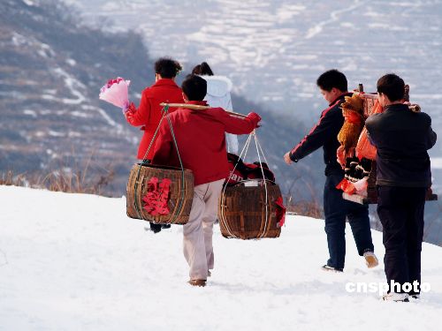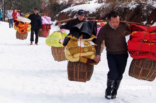 2月2日,新娘家人挑著嫁妝,踩著積雪送新娘。由于湖南地區又一次普降大雪、暴雪,路面結冰。當天,湖南冷水江一新郎步行十多公里踏雪將新娘迎娶回家。中新社發 龔高翔 攝