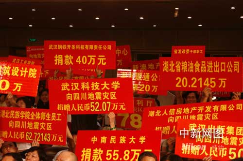 中新網(wǎng)武漢5月22日電 (記者 艾啟平)22日晚8點(diǎn)至11點(diǎn),湖北省抗震賑災(zāi)晚會(huì)《我們心相連》在武漢洪山禮堂舉行。在晚會(huì)現(xiàn)場(chǎng),中共湖北省委書記羅清泉、湖北省長(zhǎng)李鴻忠等帶頭為四川地震災(zāi)區(qū)捐款,全省企業(yè)和社會(huì)各界及電視觀眾紛紛響應(yīng),截至晚會(huì)結(jié)束時(shí)共收到捐款超過(guò)一億元人民幣。