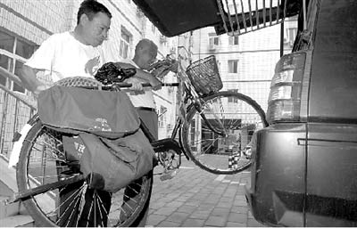 在志愿者的幫助下,楊永國老人(右)把自行車抬到中國郵政集團公司的車上,將自行車贈與該公司。 記者張沫/攝