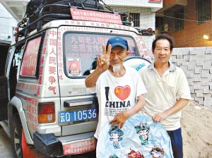 記者在廣州中大北門后面的一個小旅館見到了張汝侯、張光澤父子和他們貼滿奧運宣傳標語的越野車。張汝侯老人1919年出生,白族人,走路有點顫抖,很難相信他坐車行了31個省市自治區(qū)、341個市、2000多個縣。