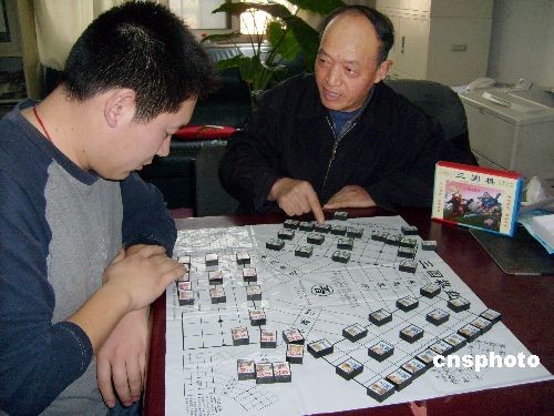 魏樹愛是中國第二大油田勝利油田勝利采油廠離退中心的一位退休教師。他告訴筆者,很喜歡看三國演義,從上世紀九十年代開始,就開始琢磨三國棋了,光是三國棋盤,就畫了100多張,把家里的掛歷都給畫滿了。他笑著說:“我當老師的時候,我把我發(fā)明的三國棋教給我的學生們下。那時候棋子我都是用木頭刻得,我的學生可以說是三國棋最早的棋手!