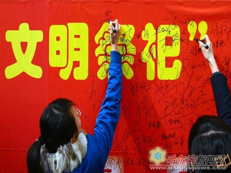 在這次簽名活動現(xiàn)場,哈爾濱市2000多名企事業(yè)單位職員與數(shù)千名社區(qū)居民和游客陸續(xù)在簽名簿上簽名,近百人在感言簿上留取了真情感言。