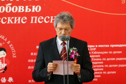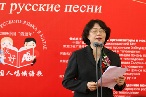 國際在線消息:(記者 衛(wèi)寧)2009年5月26日,由國家廣播電影電視總局主辦,中國國際廣播電臺、中央人民廣播電臺、北京電視臺聯(lián)合承辦的“情動俄羅斯——中國人唱俄語歌大型選拔活動”在北京俄羅斯聯(lián)邦駐華使館舉行了盛大的啟動儀式和新聞發(fā)布會。教育部副部長郝平、外交部副部長李輝、國家廣電總局副局長田進、中國人民對外友好協(xié)會會長陳昊蘇、俄羅斯駐華大使拉佐夫和中國國際廣播電臺臺長王庚年以及活動各大分唱區(qū)承辦方代表、中俄兩國媒體記者和俄語界、文藝界代表等150余人共同出席了啟動儀式和新聞發(fā)布會。