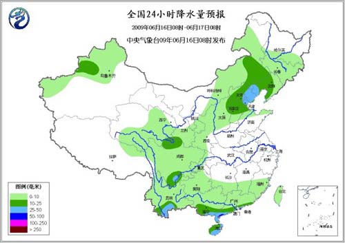 附圖 全國(guó)降水量預(yù)報(bào)圖(6月16日08時(shí)~17日08時(shí))