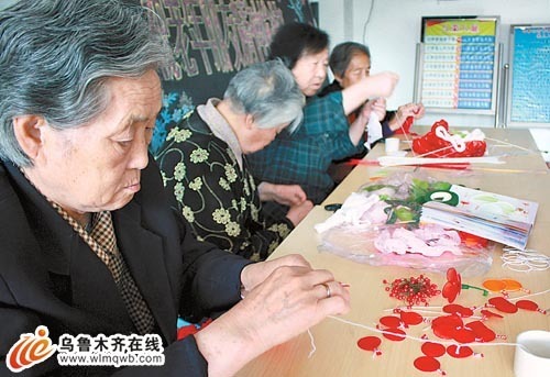 6月16日,烏魯木齊市養老福利院老人在學習扎花。該公寓內150張床位已經住滿,床位緊缺現象從去年年初開始一直持續到現在。